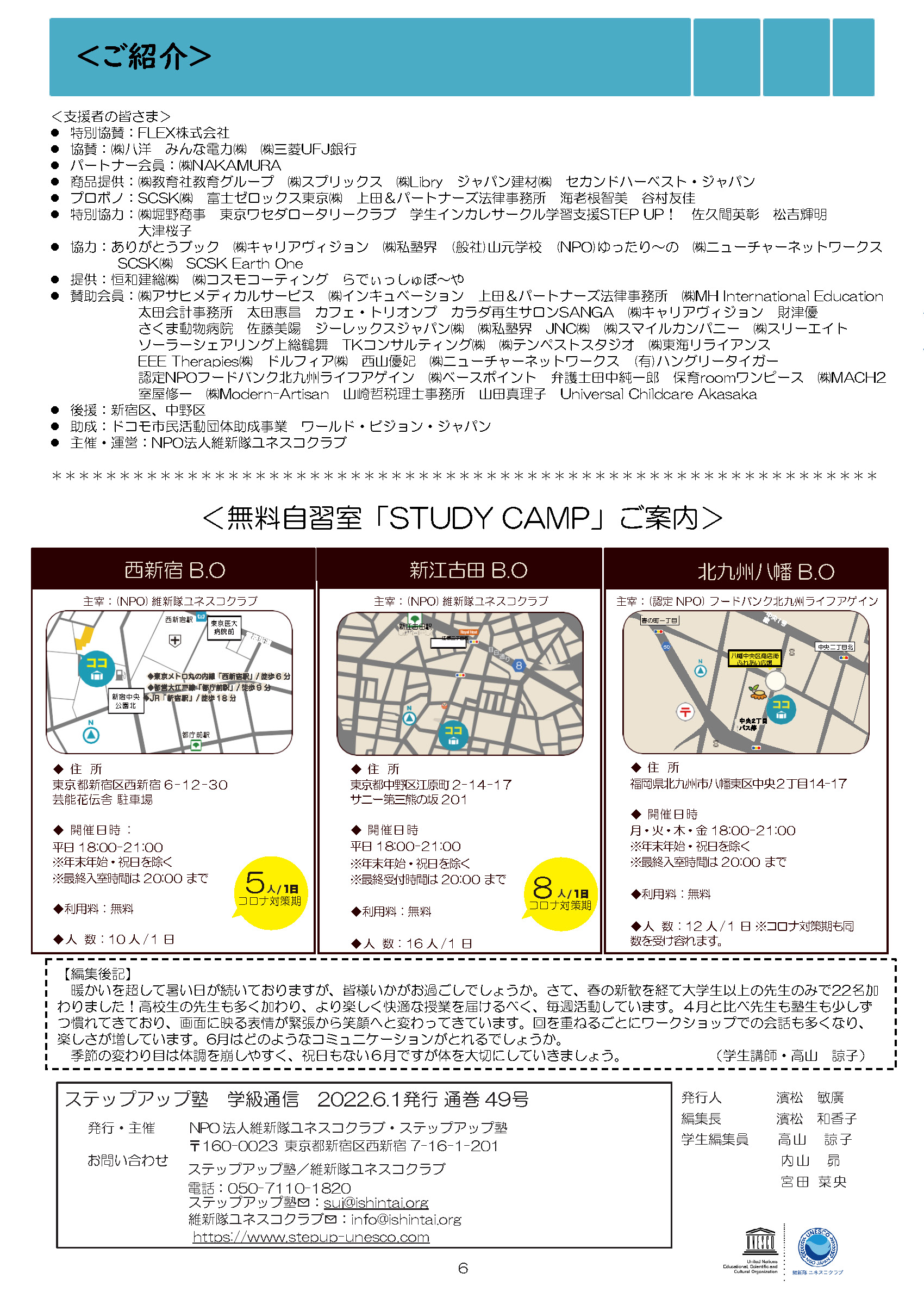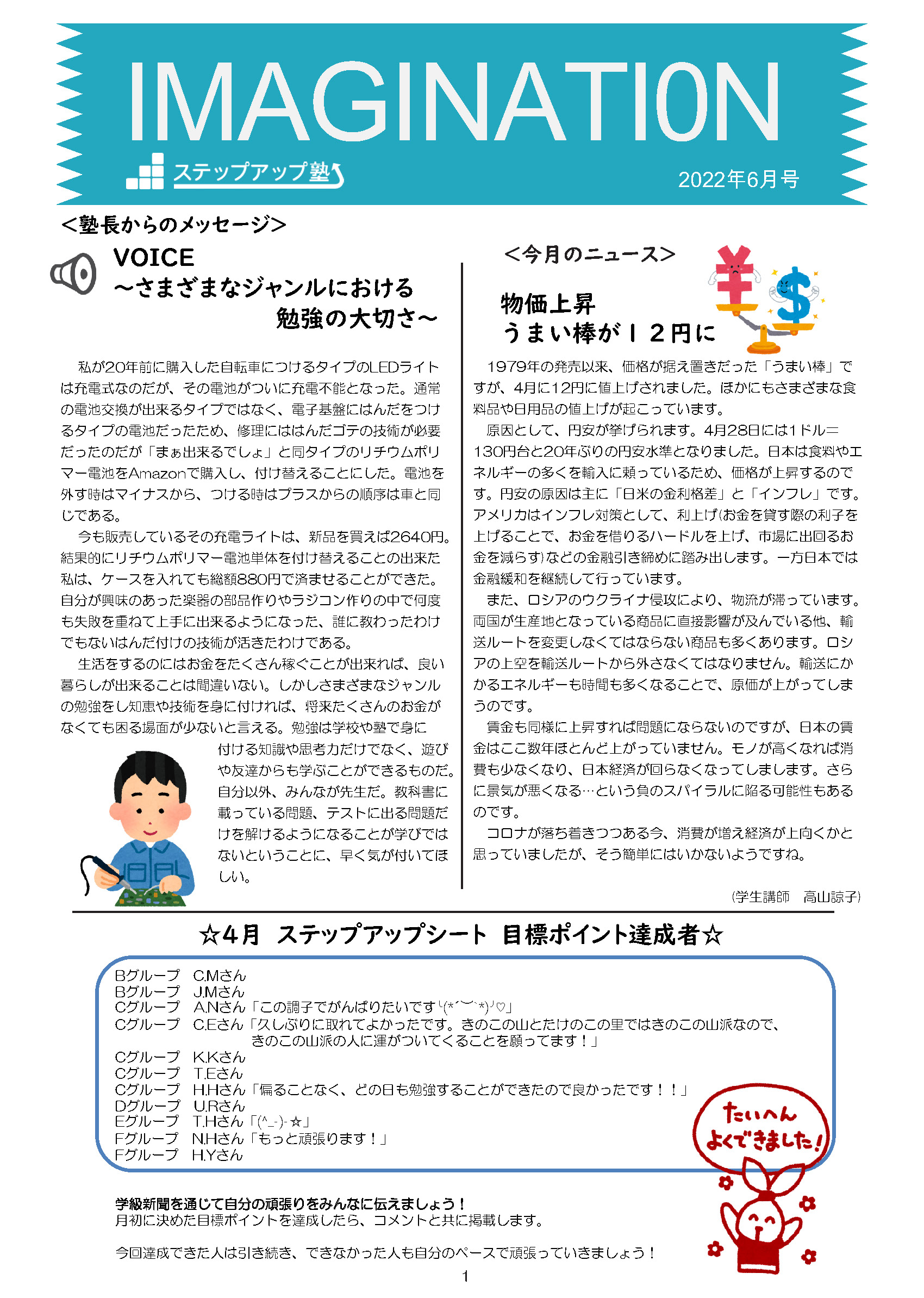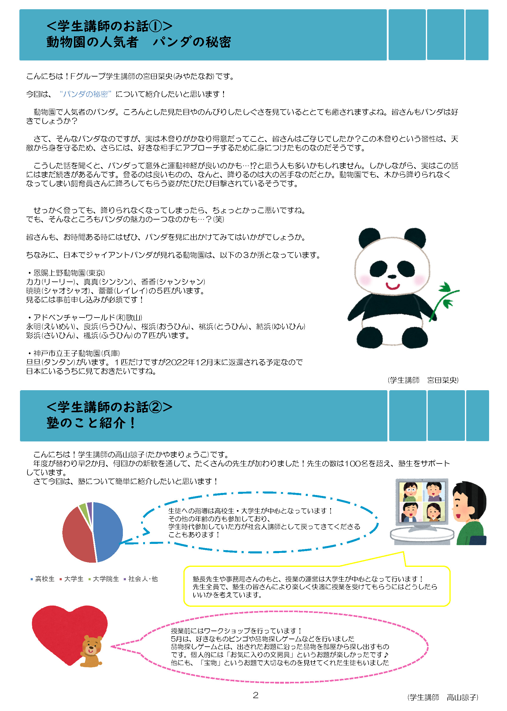 こんにちは!今月も学級新聞6月号をお送りします。学生ボランティア講師たちが塾生に楽しんでもらえるように、毎月工夫しています。皆さんもぜひ、塾生になった気持ちで楽しんで下さい!
