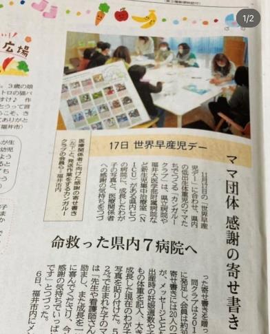 合同お話会を、福井女性財団様のご協力のもと日曜日に開催。世界早産児デーに合わせ、作成した寄せ書きの発 送準備も同時に実施した。日曜ということで、普段はお仕事でなかなか来れない 3 名の新しい方をお迎えして、今 まで封印してきたお母さんのお気持ちをお聞きすることができた。涙ぐんでお話されるその様子に私達も共感を覚 え胸が熱くなった。成長と共に悩みが変化し、場合によっては深刻な悩みに繋がることもある。でもそれはお母さ んだけでなく小さく生まれたお子さん自身が成長と共に自分自身と闘っている。私達はそれを忘れずに、長い目で 優しく寄り添う姿勢で、この子たちのために何ができるのかを考え続けていきたいと思う。