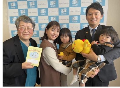 2023 年 3 月 兵庫県庁でリトルベビーハンドブックの手交式 齋藤知事へ小さく産まれた赤ちゃん の大変さや、今後の課題、支援の希望を直接伝えました。