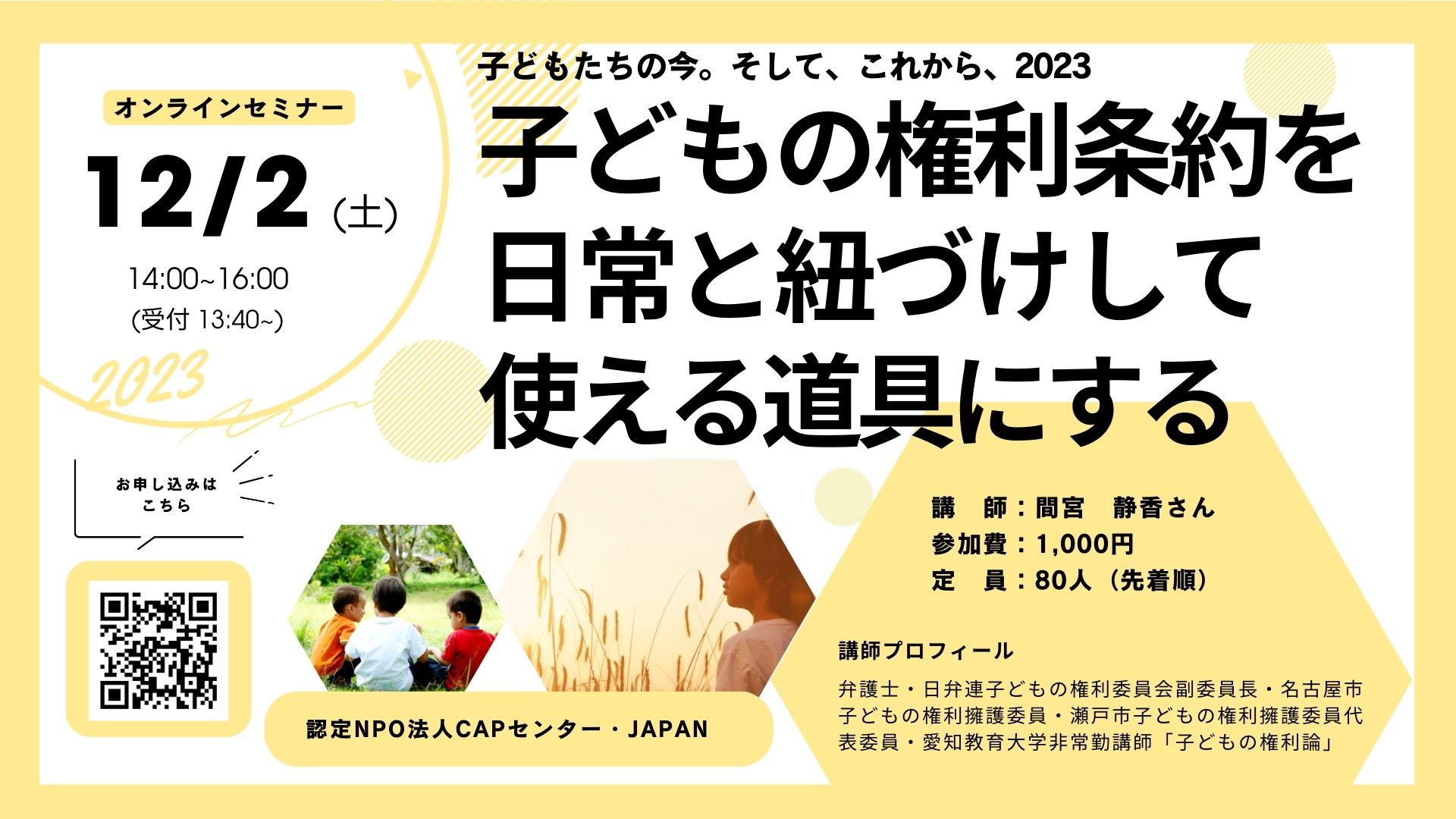 私たちCAPセンター・JAPANは、「子どもの権利条約」の理念を知るだけでなく、「ああ、そういうことか」と気づき、子どもとの日常でその理念を実現しようとするおとなを増やすこと、そのおとな同士がつながることが重要だと考えています。「子どもの権利」は決して日常と解離した遠くにあるものではありません。子どもの権利を保障するおとなの役割を果たしていくために、日常生活と子どもの権利を紐づけしていくプロセス、気づきを持つ体験をご一緒しませんか?セミナーの講師は、日本弁護士連合会子どもの権利委員会副委員長で、子どもの権利に詳しい弁護士の間宮静香さんです。