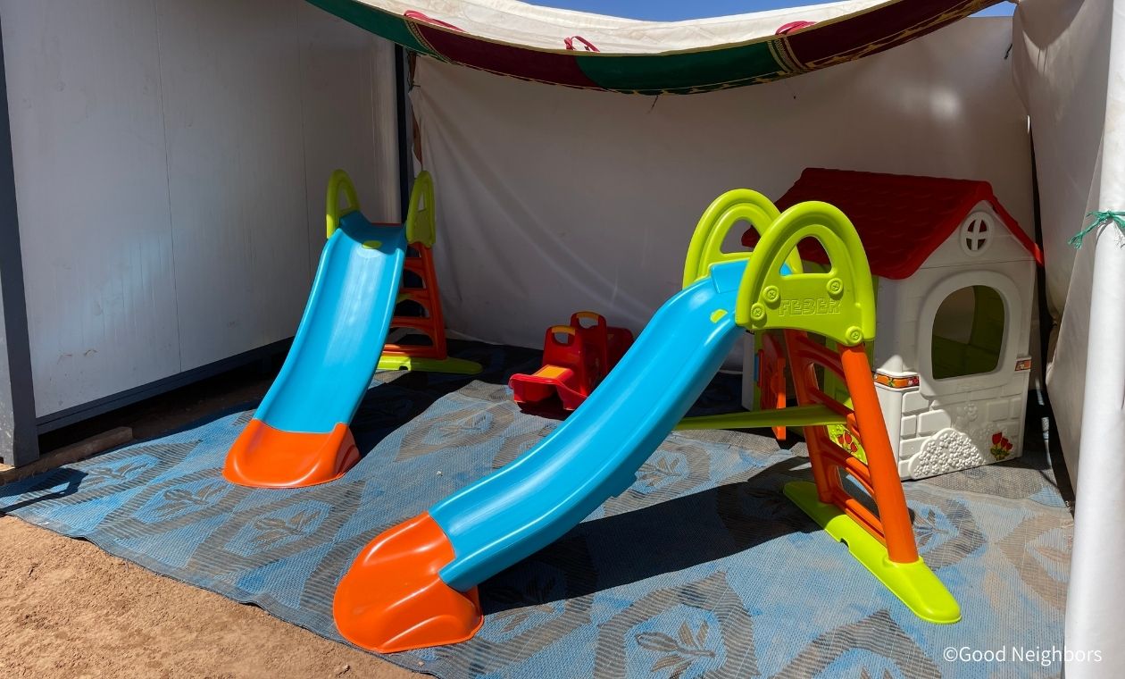 グッドネーバーズは提携団体Shifa Foundationとともに、対象となる5つの村でCFSを設置し、運営を行っています。子どもたちはここで、遊んだり学んだりして、安全に過ごすことができます。