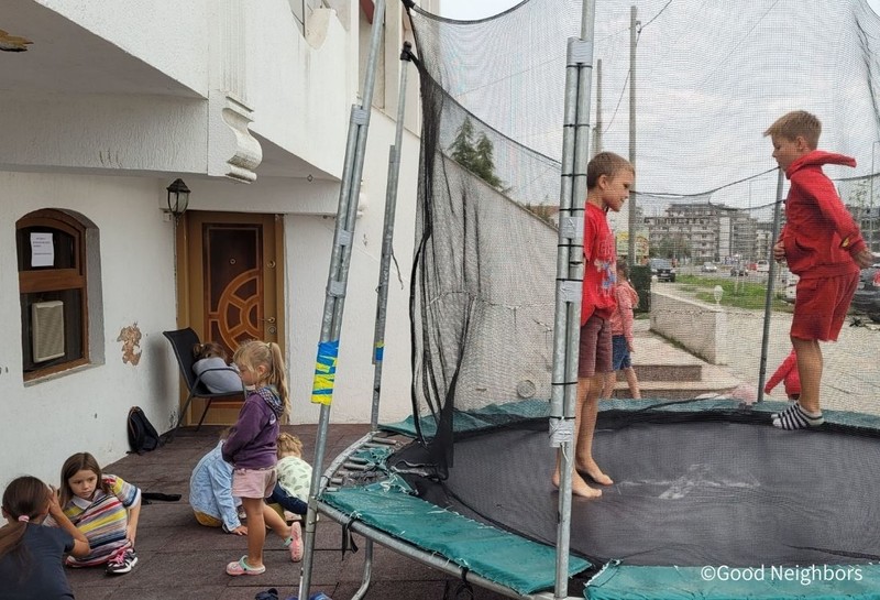 シェルターには、住居スペースに加えて子どもの遊び部屋やトランポリンのある外のスペースも用意されており、ここで生活する子どもたちは日々仲良く過ごしています。