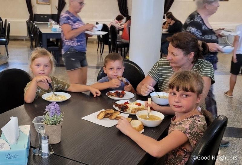 シェルターのダイニングルームで食事をする避難民(2023年8月8日、ルーマニア・コンスタンツァ市)