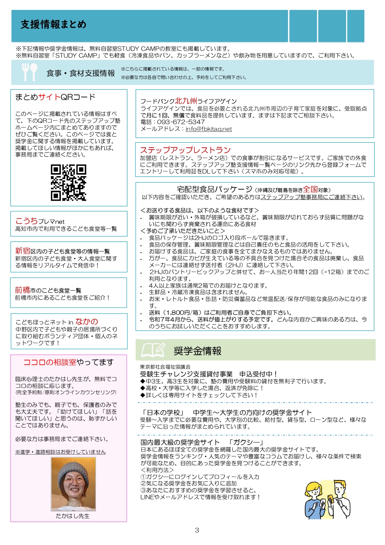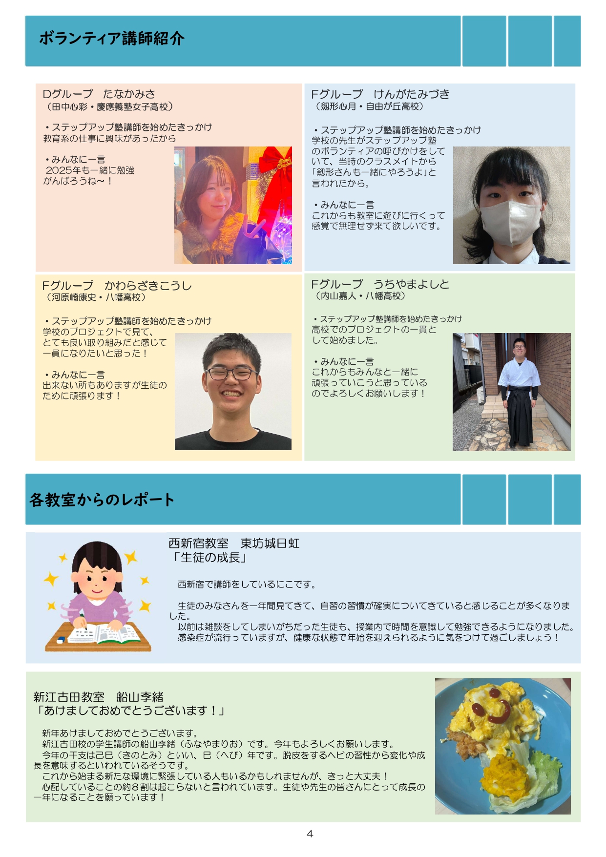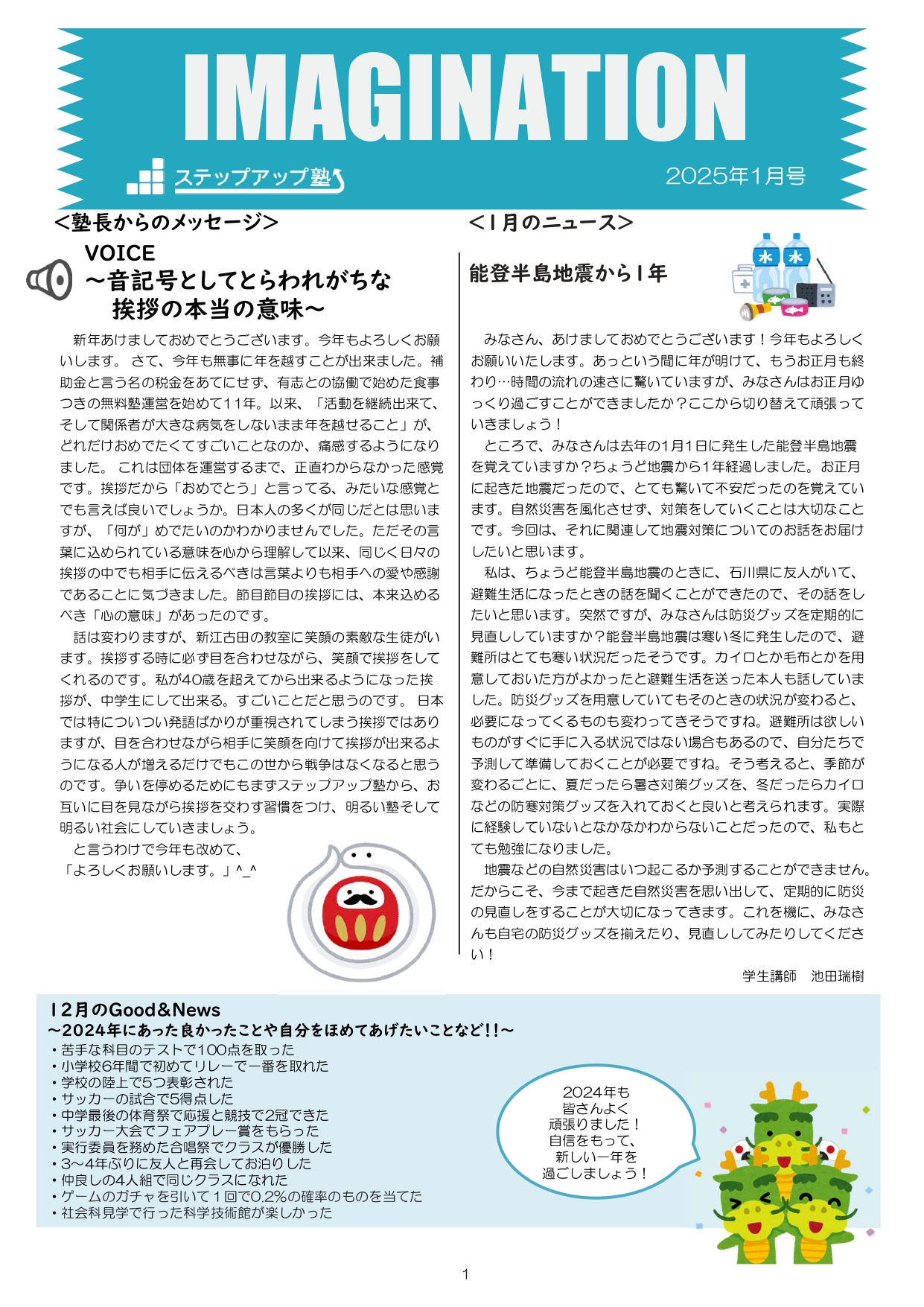 今月も食事つき個別指導型無料塾「ステップアップ塾」の学級新聞をお送りします。毎月学生ボランティア講師が作成しています。毎月塾生と講師が一緒に楽しく読む時間を設けていますので、皆さんも先生になった気持ちで読んで下さいね!