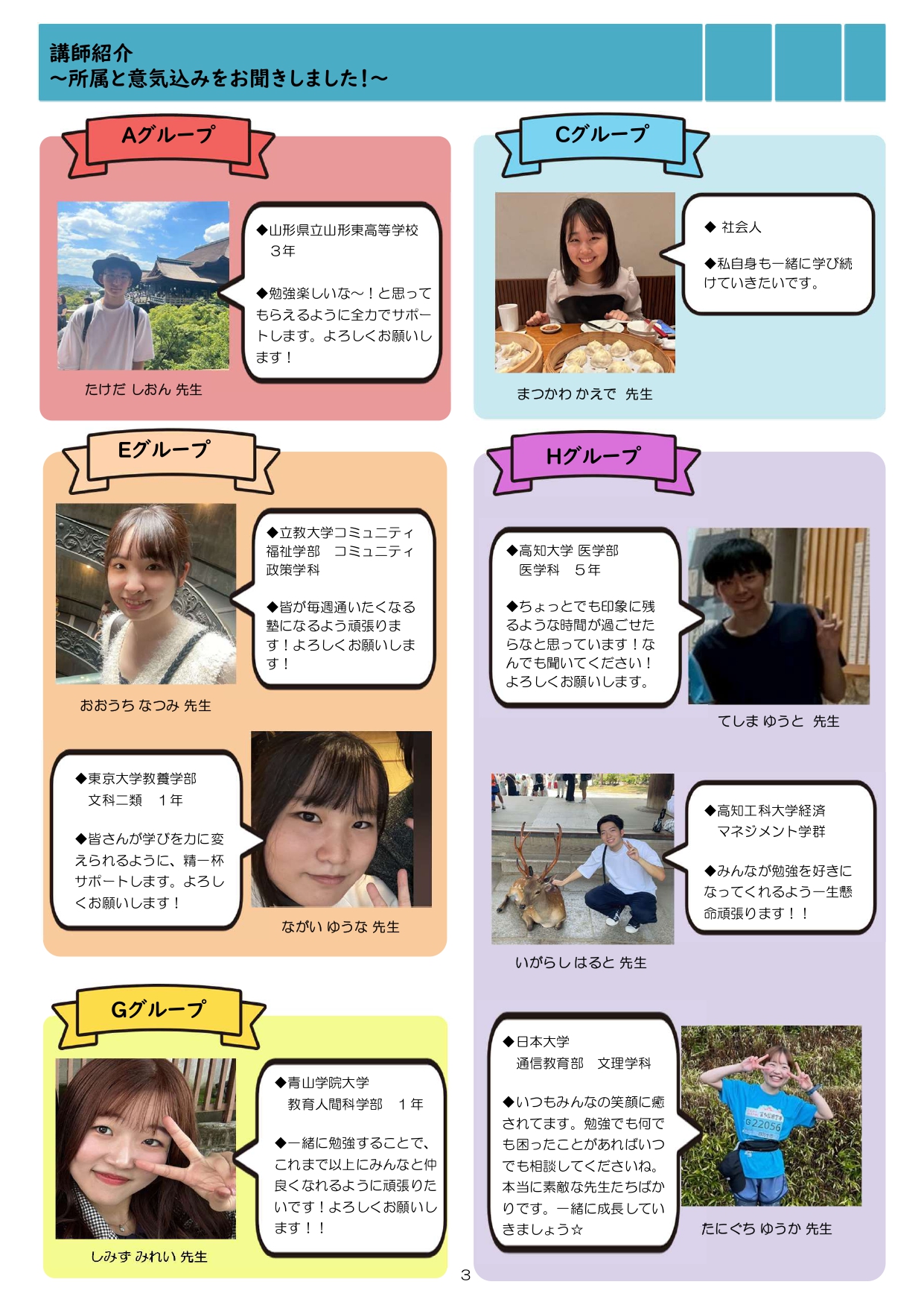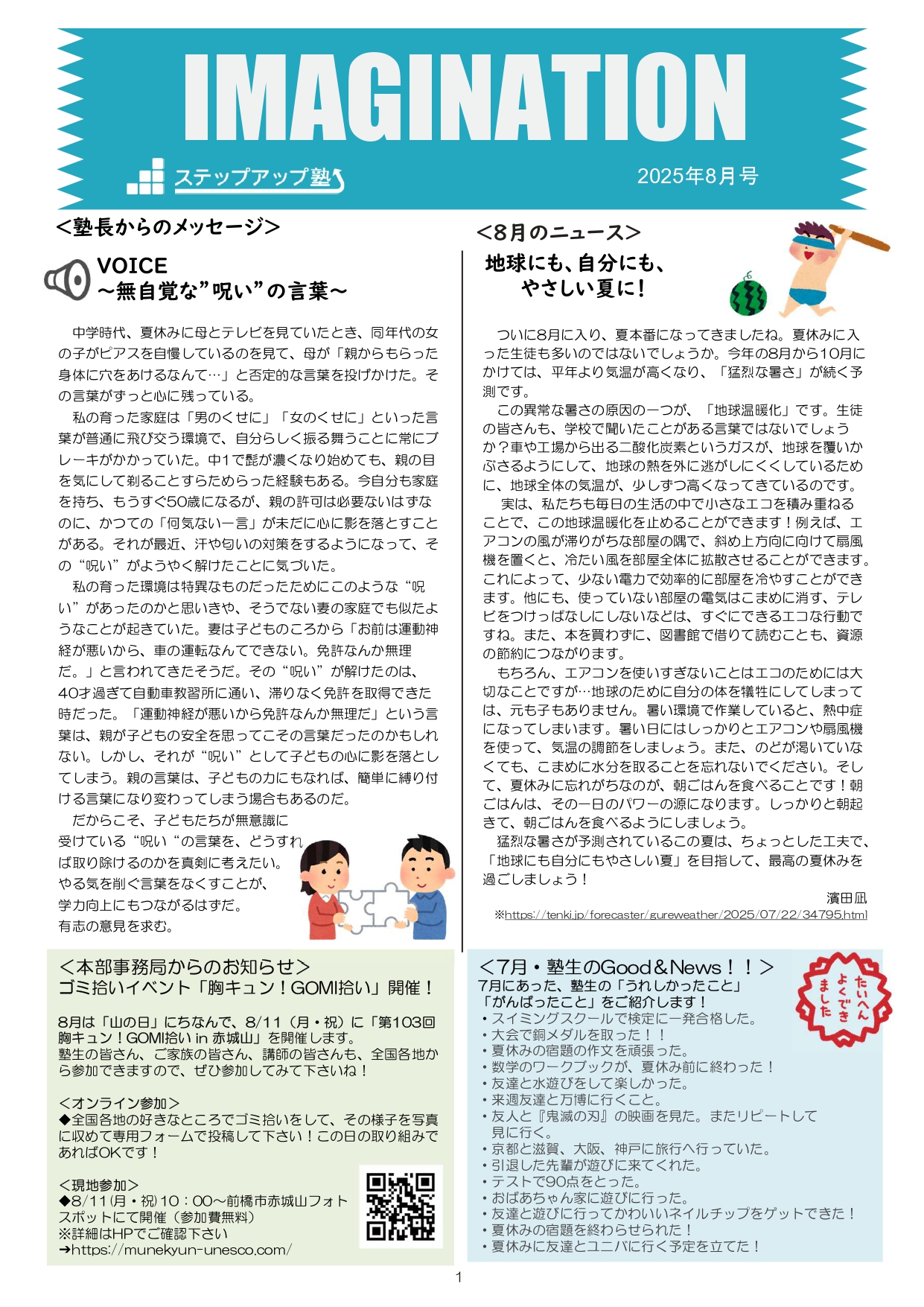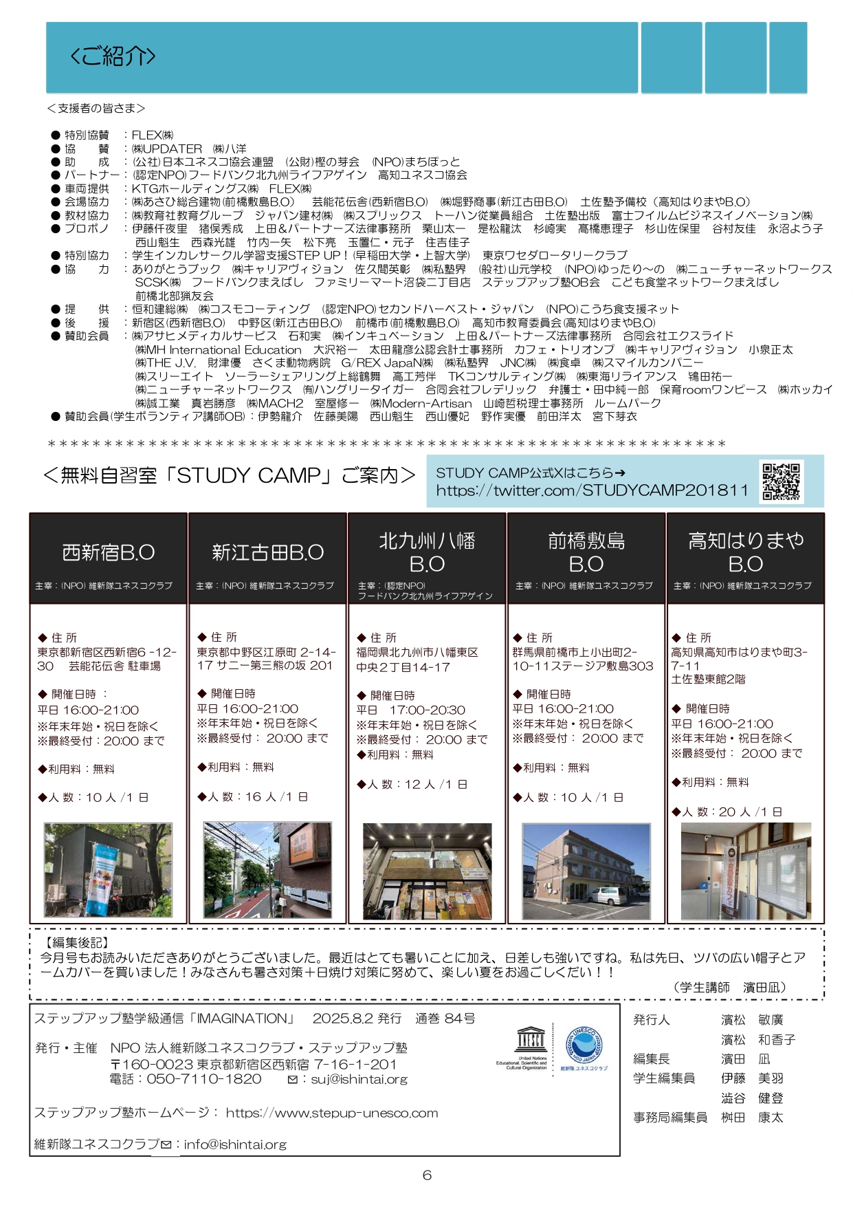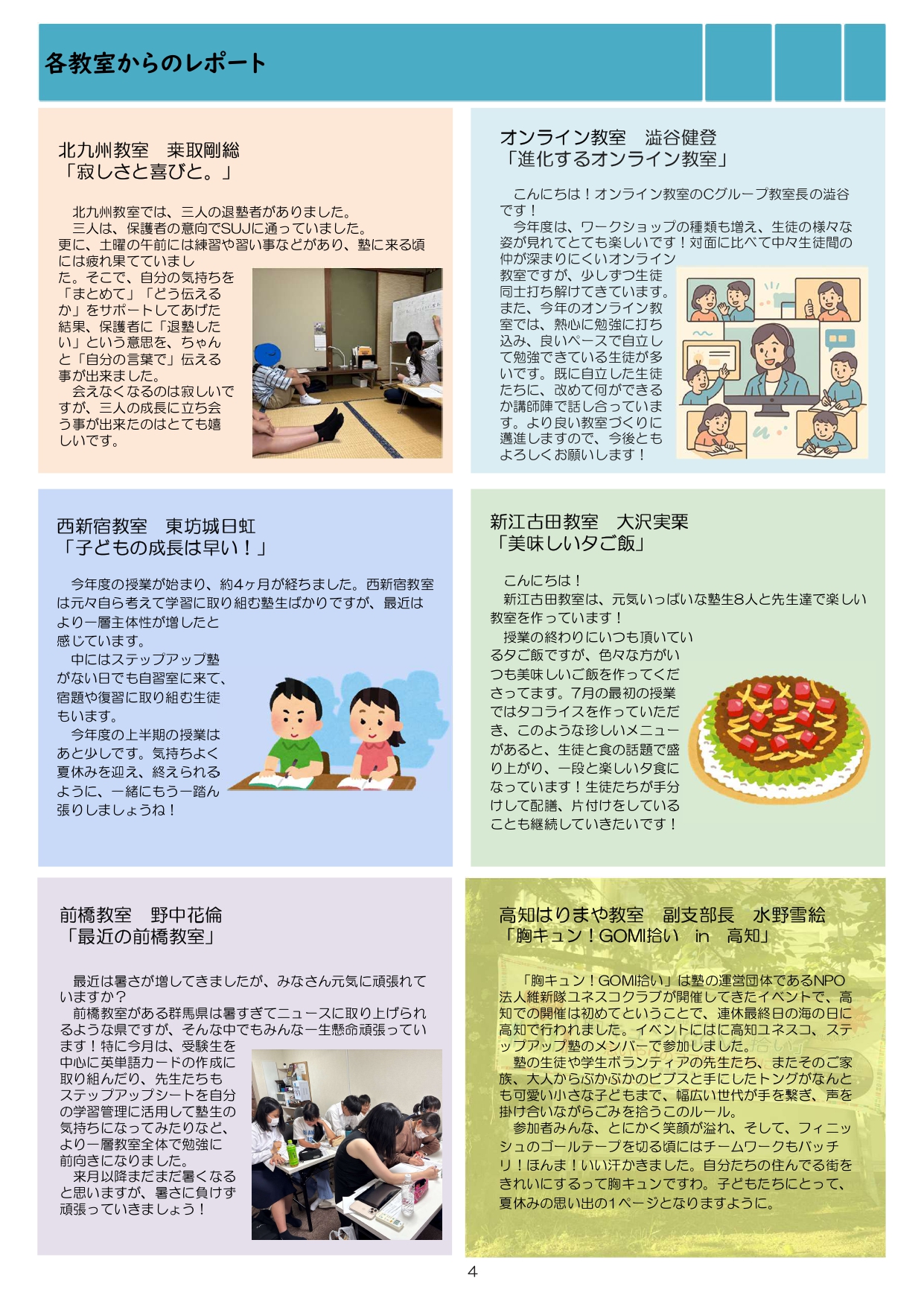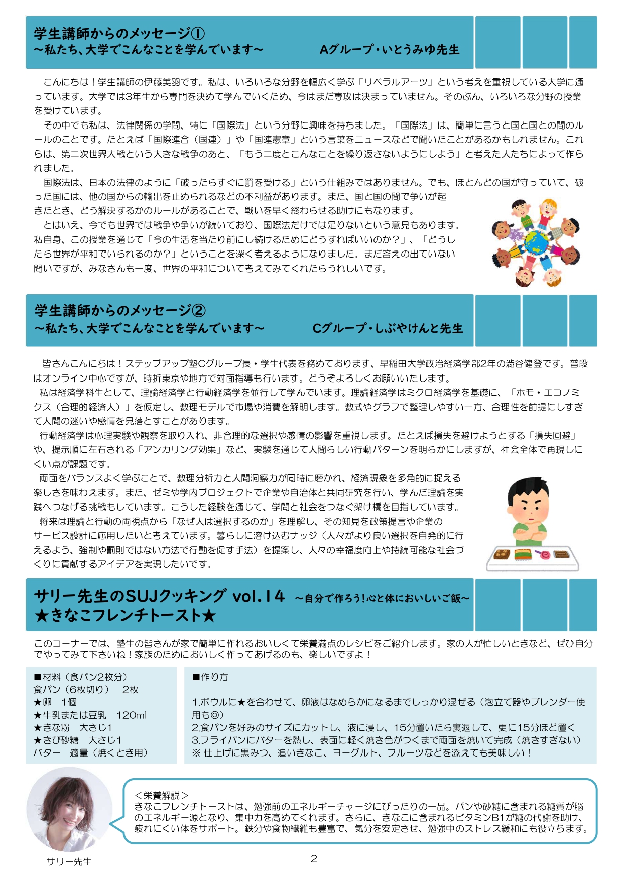 今月も食事つき個別指導型無料塾「ステップアップ塾」の学級新聞をお送りします。毎月学生ボランティア講師が作成しています。講師のみなさんの紹介コーナーもあるので講師のことを身近に感じながら楽しく読んでくださいね!