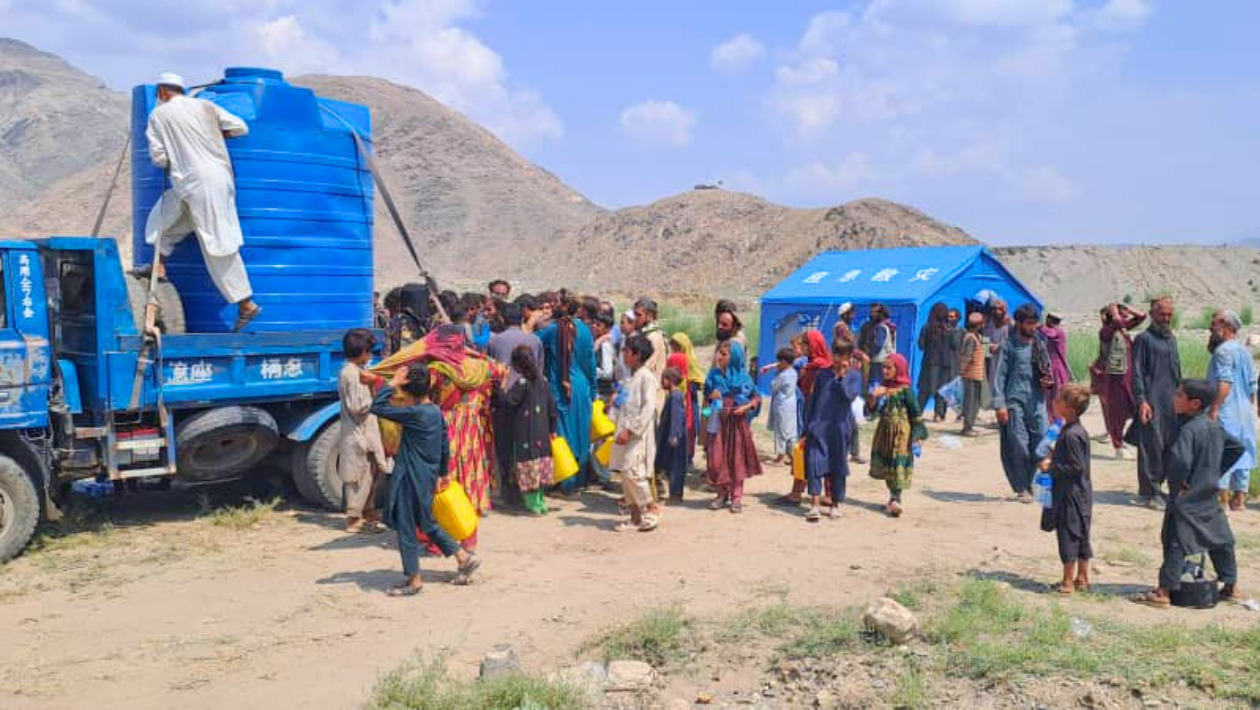 政府が用意した給水車に集まる被災者=アフガニスタン東部クナール州ヌルガル地区で2025年9月5日