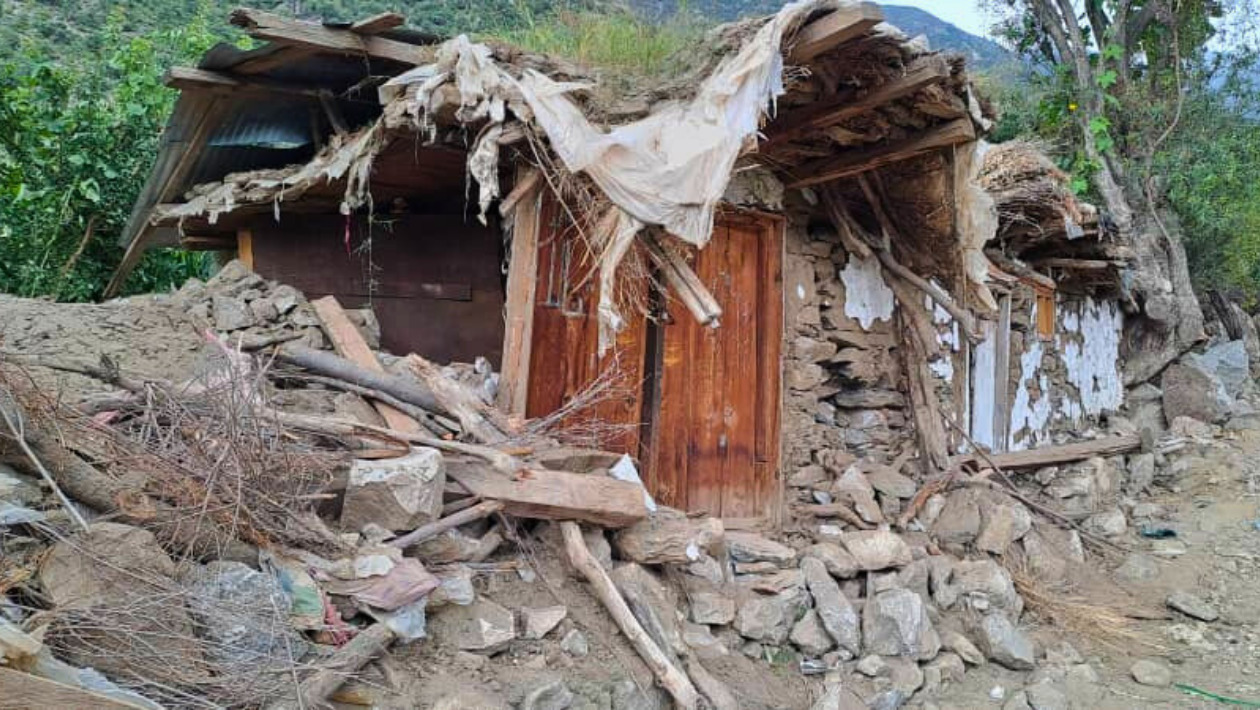 倒壊した日干しれんが造りの民家=クナール州ヌルガル地区で2025年9月5日