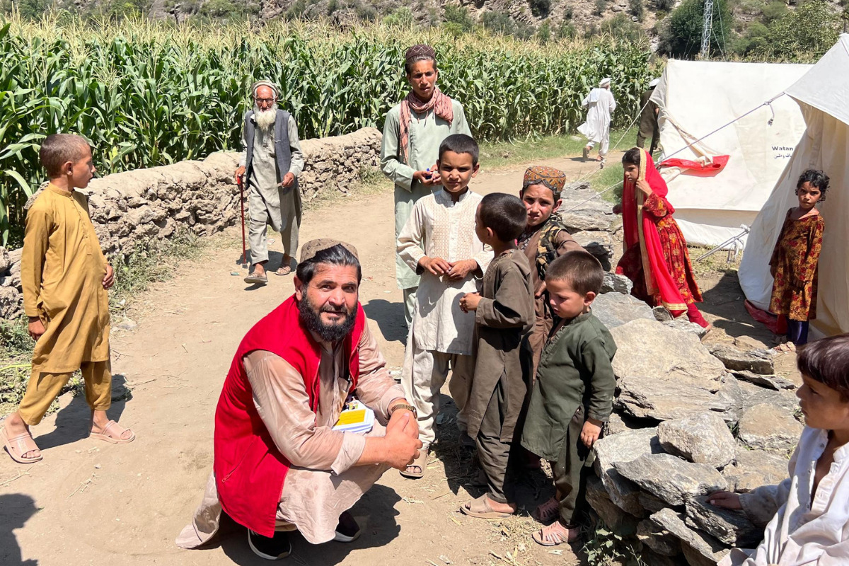 避難している家族に話を聞くAARカブール事務所職員=クナル県南部チャウカイ地区で2025年9月8日