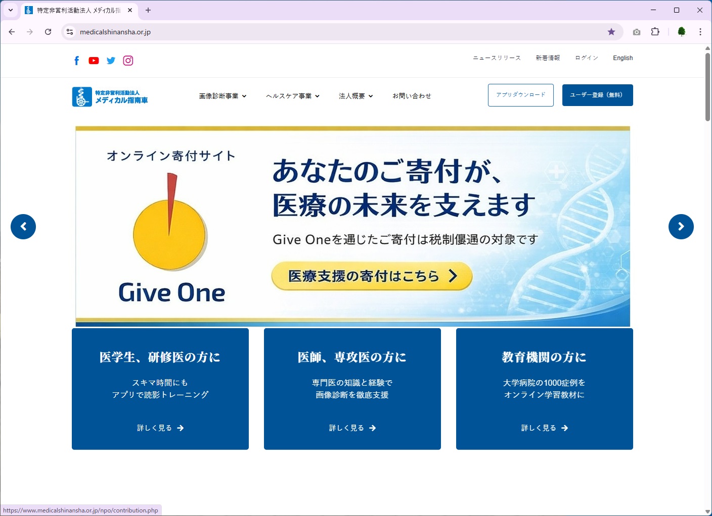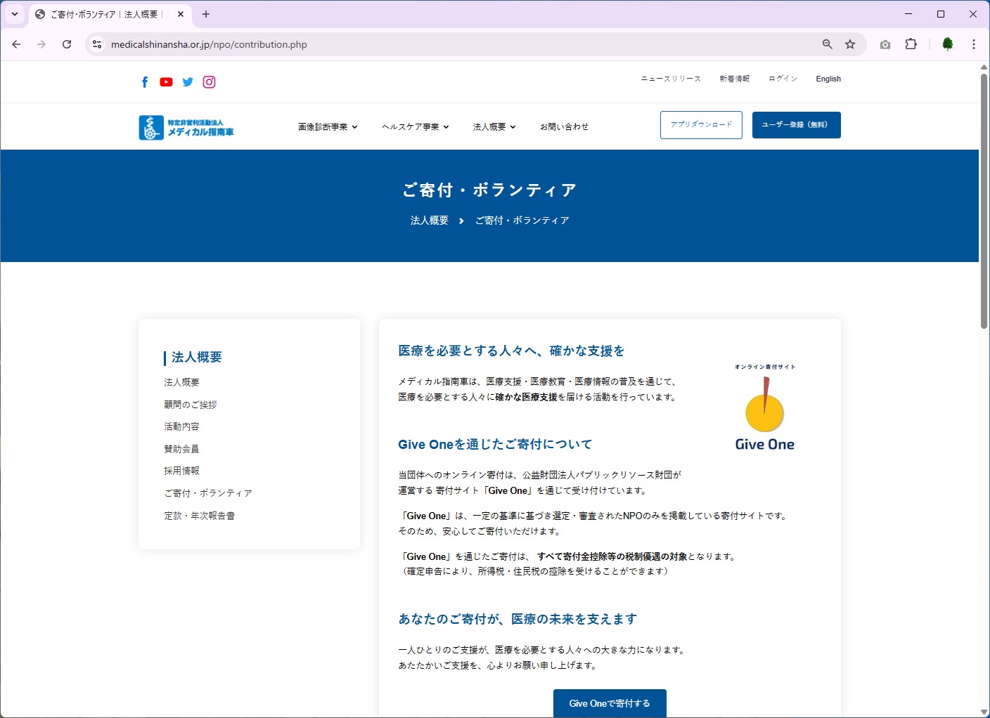 メディカル指南車のホームページから「オンライン寄付サイトGive One」の寄付プロジェクトへの導線を追加しました、トップページのバナーか、ご寄付のメニューからアクセスして会員登録してください。