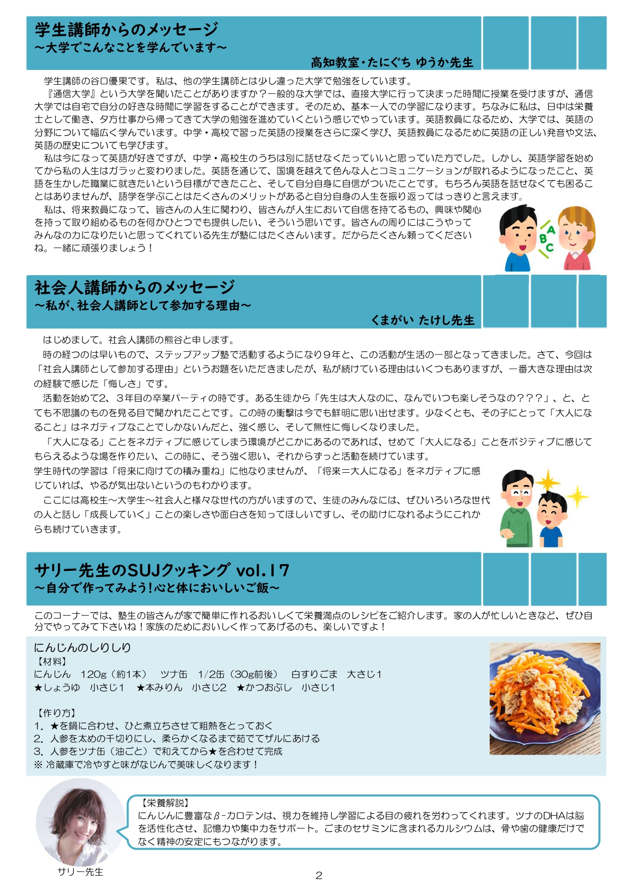 今月も食事つき個別指導型無料塾「ステップアップ塾」の学級新聞をお送りします。