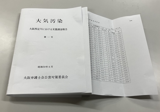 1974年、大阪弁護士会公害対策委員会(委員長 真鍋正一)は重点活動の一つとして西淀川問題小委員会を設置し、「人権擁護の立場から」大阪の大気汚染公害問題に取り組んだ。写真の冊子はこのときの調査成果で、1975年6月付け、『大気汚染 大阪西淀川における実態調査報告第一号』と名付けられた。9月には「公害健康被害補償法」(公健法)が実施されようとしていたときでもあった。