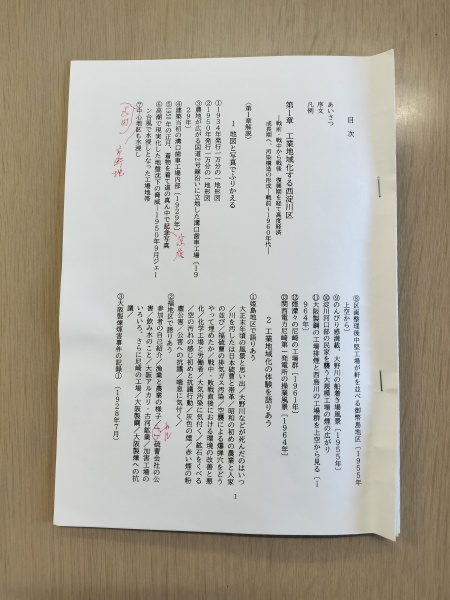 ただちょっと補足しておかなければいけないのは、ここ数日かけて資料集の原稿から掲載を見合わすものを数点選び出し、さらに版組の工夫によって結局8ページ分のページ数節約を確保して、これにて前後に載せる必要文書の掲載スペースを確保できたことが1点。もう1つは、それに対応する形で、資料集のもくじ案を作成したことである。いずれも、問題に直面して、西淀川区民の人たちが記録したり意見を述べたりしたもので、全部で136点288ページという分量になったことが判明した。これだけの基礎資料となる文章を作り上げたこと、その活動力に改めて驚きの念を感じた。このもくじをいろんな人に見せて、本作業が大きな山場を越えたことを共に喜び合った。だが、まだまだ喜べないことも残っている。1つは、翻刻した文章が原本と合致しているかの校訂作業。これは、大変な作業量を予定しておかなければならない。第2は、各章の解説である。解説文は、各章ごとに提起されていた問題の時代的背景を読者の方々に理解してもらい、その中で、西淀川公害反対闘争が成し遂げてきた活動の意義と問題点も含めて解明していかなければならない。というわけで、頭を冷やして考え直したいと思っている次第。