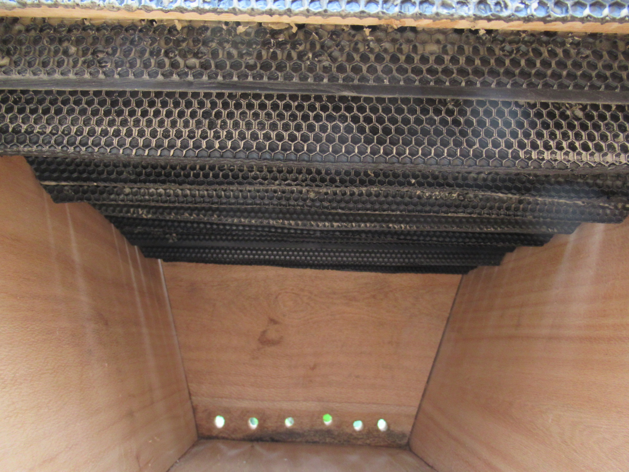 写真: 巣箱に設置されたプラスチック巣礎(上に写っている黒い部品)