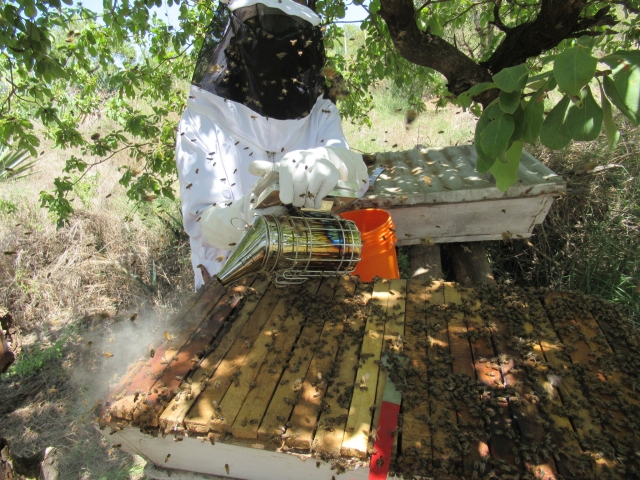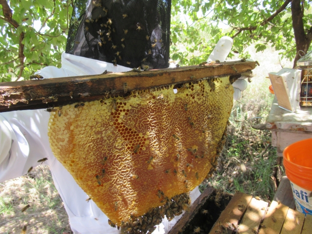 こちらは今が一番暑い時期で、炎天下で防護服を着ての内検作業は本当に大変です。もう汗でびっしょり。おまけにアフリカのミツバチは気性が荒くて、養蜂箱の蓋を開けたとん集団で襲いかかってきます。防護服にバチンバチンと音をたてて突撃してきて、慣れない人は生きた心地がしないでしょう。もちろん、ミツバチを大人しくするためのビースモーカー(燻煙器)も使いますが、群れにもよりますが、今回の群れはまったく効き目なし。結局防護服の中にまで潜り込まれ、3カ所刺されてしまいました。腫れあがって痛いです。。。