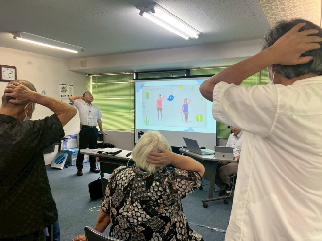 講話の後は呼吸筋ストレッチ体操。環境再生保全機構の動画を観ながら、4つの会場で同時に体操に取り組みました。