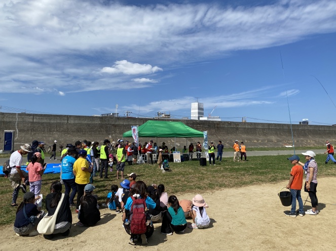 淀川河川敷に集まった参加者52名(スタッフ入れて80名程)が約1時間半の間に、それぞれ釣果を競いました。