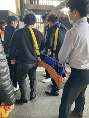 布担架にのって垂直避難を体験