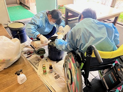 午後からは、地域の方から持ち込まれた廃油の回収作業です。集まった廃油をバケツに移してからドラム缶にまとめていきます。廃油は石鹸やバスの燃料としてリサイクルされます。においが強く、油がはねると汚れてしまう作業ですが、二人とも次第に慣れ、手際よくドラム缶に油を移してくれました。