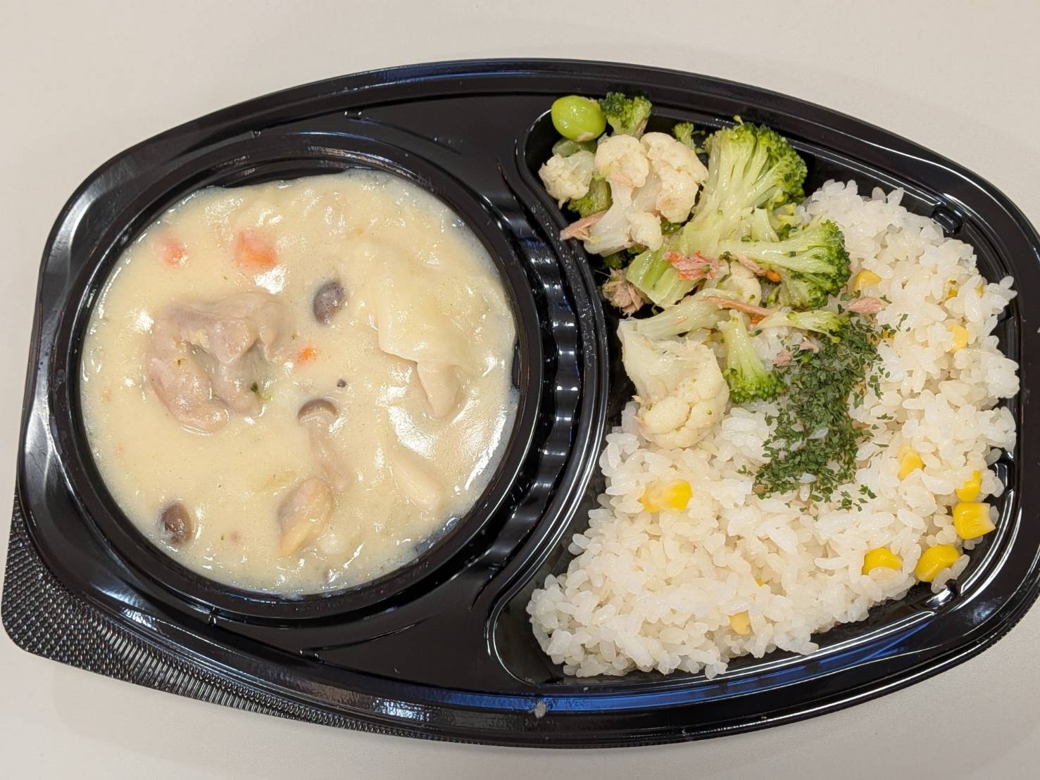 お弁当は鶏肉とシーフードのクリームシチューとコーンライス、温野菜の付け合わせ♪