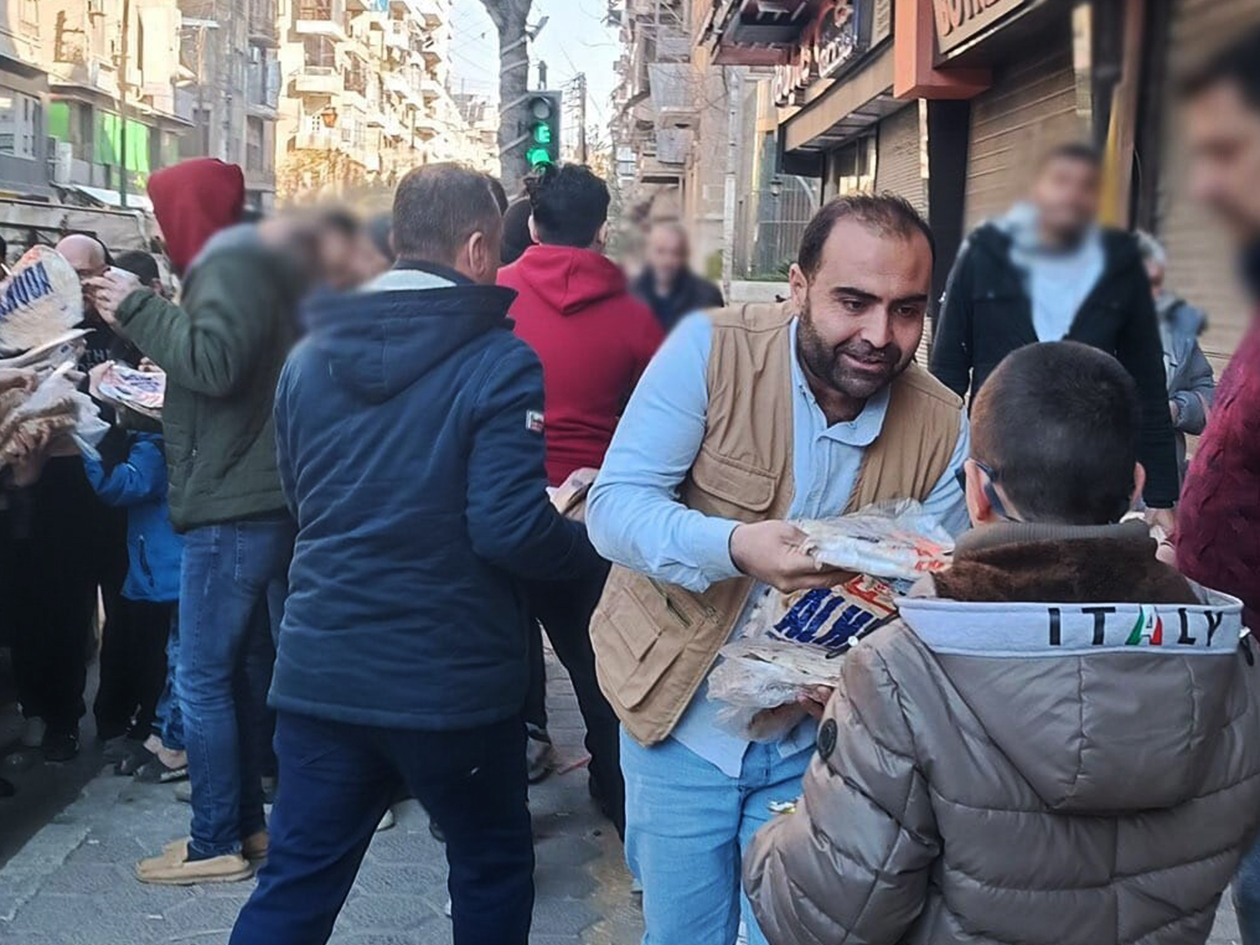 食料価格が高騰したシリア国内で人道支援団体からパンを受け取る人々(シリア 2024年12月)