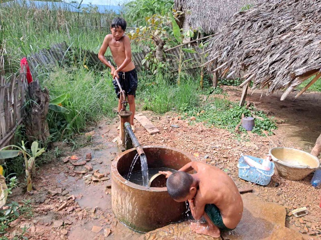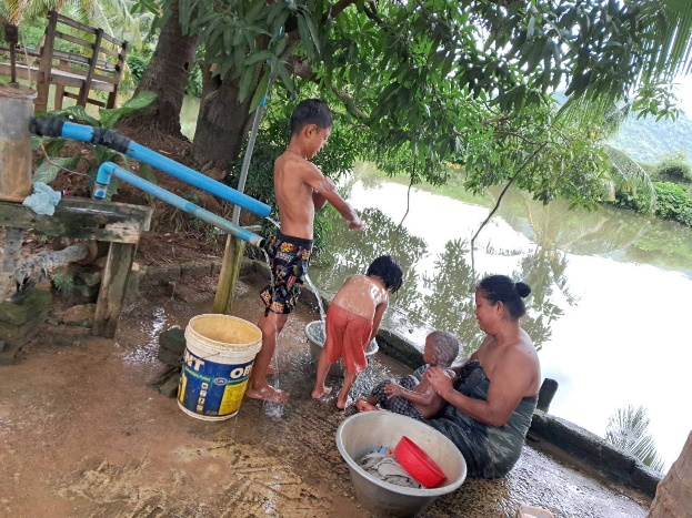 もともとミャンマーの農村地域では川、湖、運河などの自然の水場を使って入浴することが、長い歴史と文化に根差した慣習となっています。また、手動式ポンプを使って水をくみ上げ、屋外や簡易的な屋内のスペースで入浴することも一般的です。一般家庭では、大きな水がめやタンク、井戸に水を貯めることで日常的に水を利用できるようにしています。