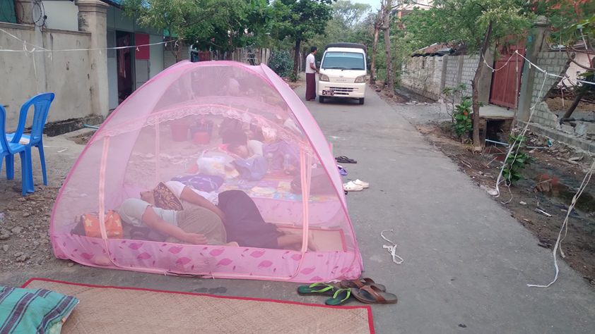 地震により、20万人以上が国内避難民となり、テントや下の写真のような簡易的な仮設の住まいで暮らしています。マンダレーやザガイン地域では、数千世帯が基本的な保護のないまま、こうした厳しい環境下での生活を余儀なくされています。