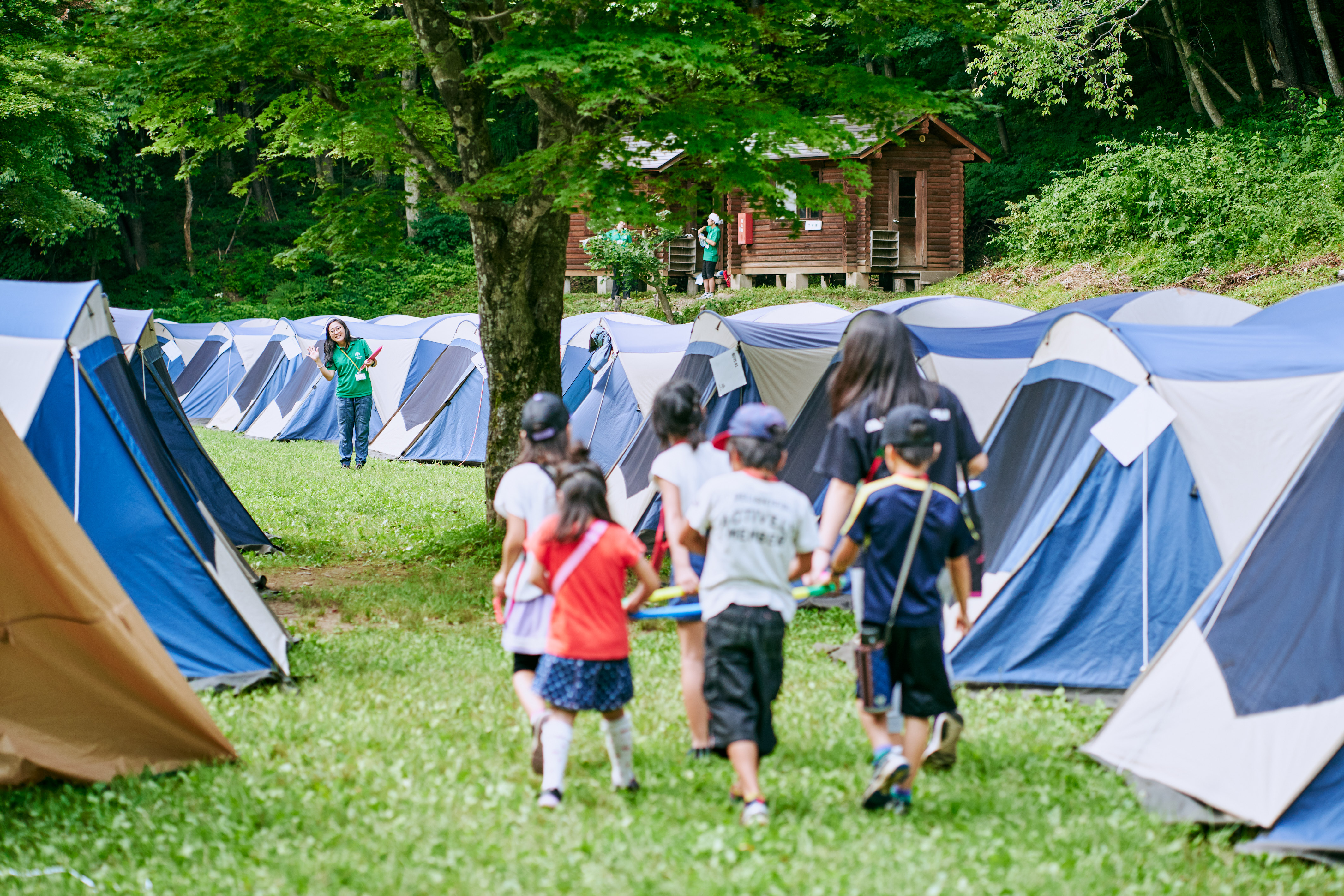 キャンプでは、大自然を活用したチーム競技や、沢登り、キャンプファイヤーなど多様なプログラムを行います。
