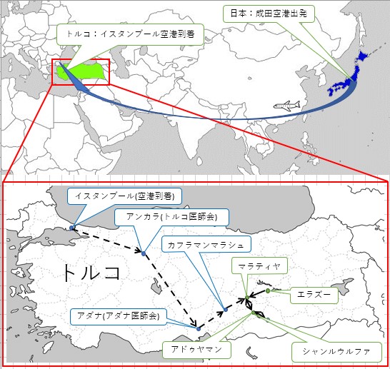 AMDAは発生直後より現地での被災状況などの情報収集を開始。甚大な被害状況を受け、2月11日、AMDA医療チームとして医師1人、看護師1人、調整員(トルコ人)1人をトルコへ派遣した。その後追加で医師1人、看護師1人を派遣し、トルコ及び地元医師会と協力し、トルコ・アドゥヤマン (Adiyaman)県を中心に健康相談や物資支援などに支援を行ってきた。