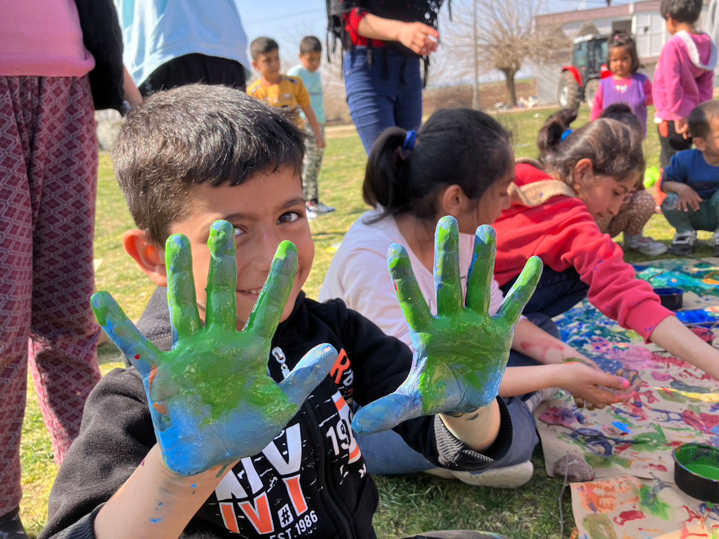 そして、いろいろな形でトルコの子どもたちとも交流した。ボランティアとして一緒に村を巡回した保育士やスポーツインストラクターたちと一緒に、村の子どもたちと体を動かし、大きな紙に絵の具をつけた手で絵を描いた。