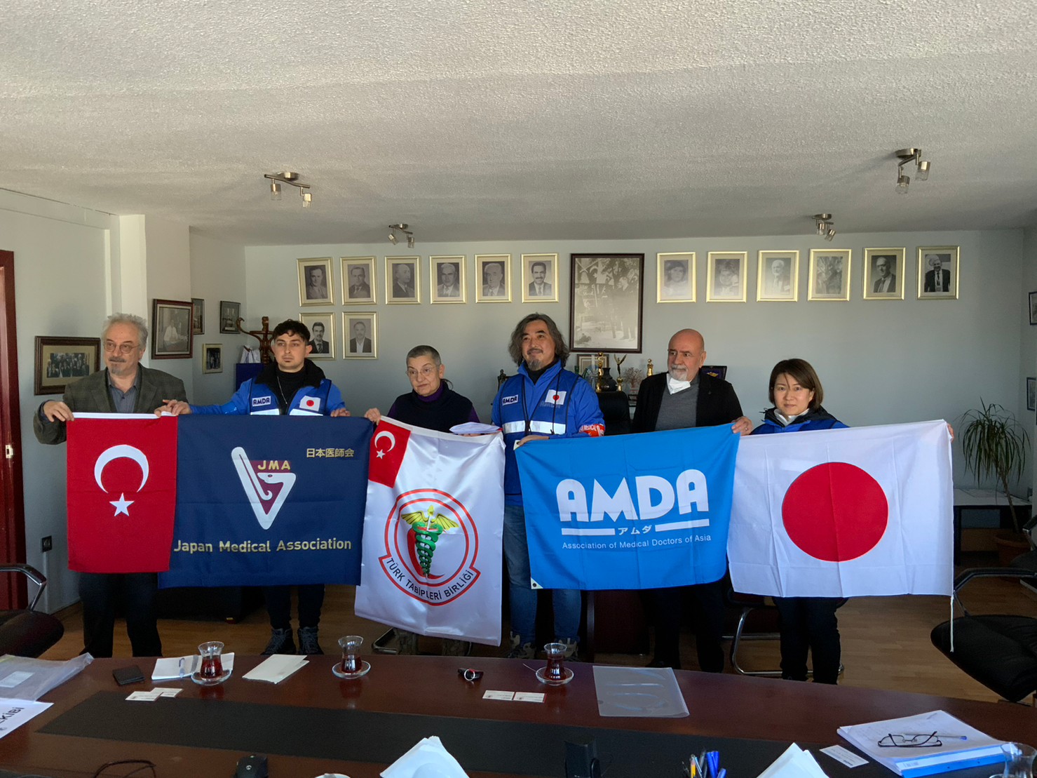 現地時間2月13日、AMDAチームは初期活動において支援を受けた日本医師会の紹介によりトルコ医師会を訪問。同会長と面会し、日本医師会から託された松本吉郎会長からの手紙と義援金を手渡した。更に、国内での被害や支援状況などを伺った。