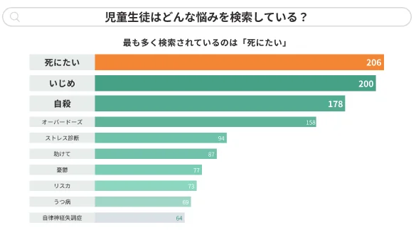 検索したキーワード別のデータからは、「死にたい」「いじめ」「自殺」といった言葉が上位を占めていることが分かります。その他、「オーバードーズ」「助けて」「リスカ」「うつ病」「自律神経失調症」といった言葉が多く検索されています。